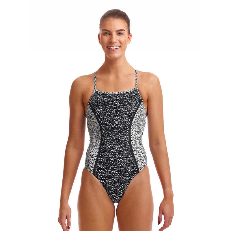 Ik gebruik lijmtechnologie om designlijnen langs het lichaam te creëren en een elastisch gebonden been dat je een matig hoog been geeft. Mijn eenvoudige verbindingsbanden kruisen je rug en houden mijn sleutelgat veilig op zijn plaats terwijl we door het water bewegen. Ik ben lichtgewicht en gestroomlijnd met een voering op het voorpand en kom met alle zorg en liefde van de productie die mij trots maakt om Funkita te zijn. Gemaakt van onze exclusieve C-Infinity stof, een 100% Italiaans polyester dat een kleurrijke doorbraak is in chloorbestendige stof technologie! De superieure keuze voor zwemmers, C-Infinity heeft een uitzonderlijke sterkte en kan zijn duurzaamheid veel langer behouden dan autres elastaan zwemkledingstoffen. Ideaal voor frequent zwembadgebruik voor recreatief en prestatiegericht zwemmen.