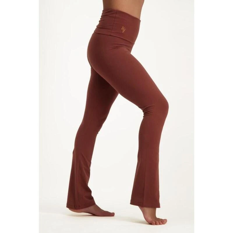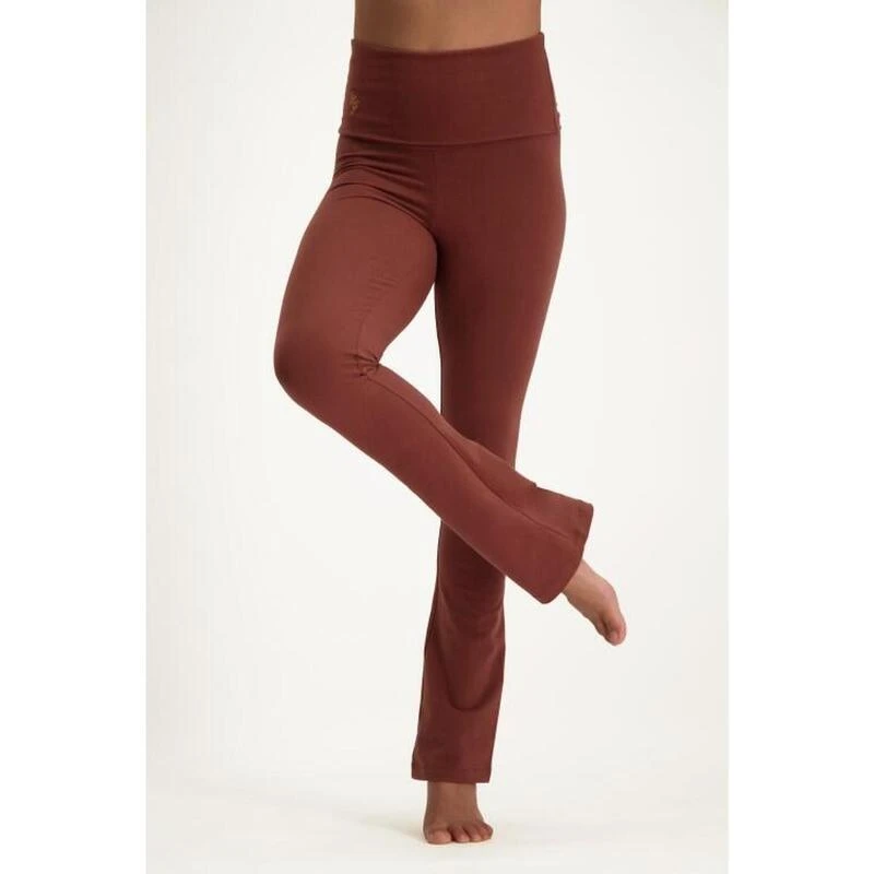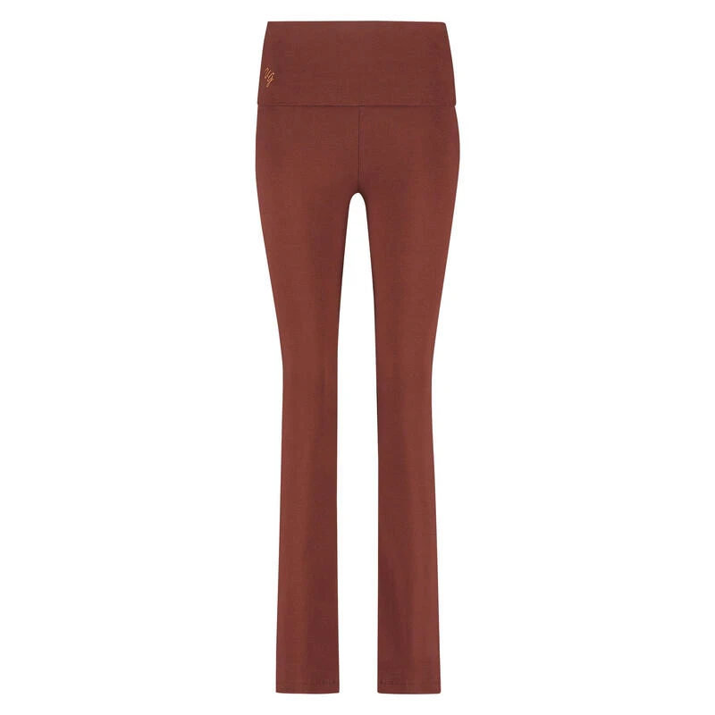 Trendy yogalegging met omslagband en wijde pijpen. Voor tijdens en na de practice. Biokatoen